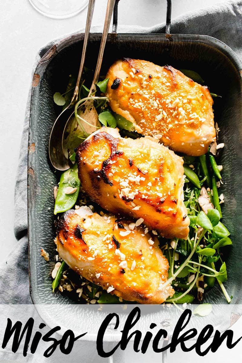 Chicken | Miso Chicken is roasted in a rich, buttery miso glaze and served with a mixture of sugar snap peas, snow peas and shiitake mushrooms.